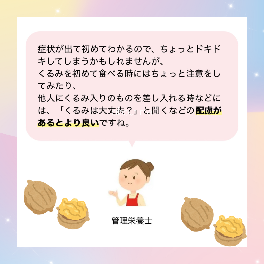くるみのアレルギー症状は、食べてから数分~2時間以内に現れることが多いそうです。