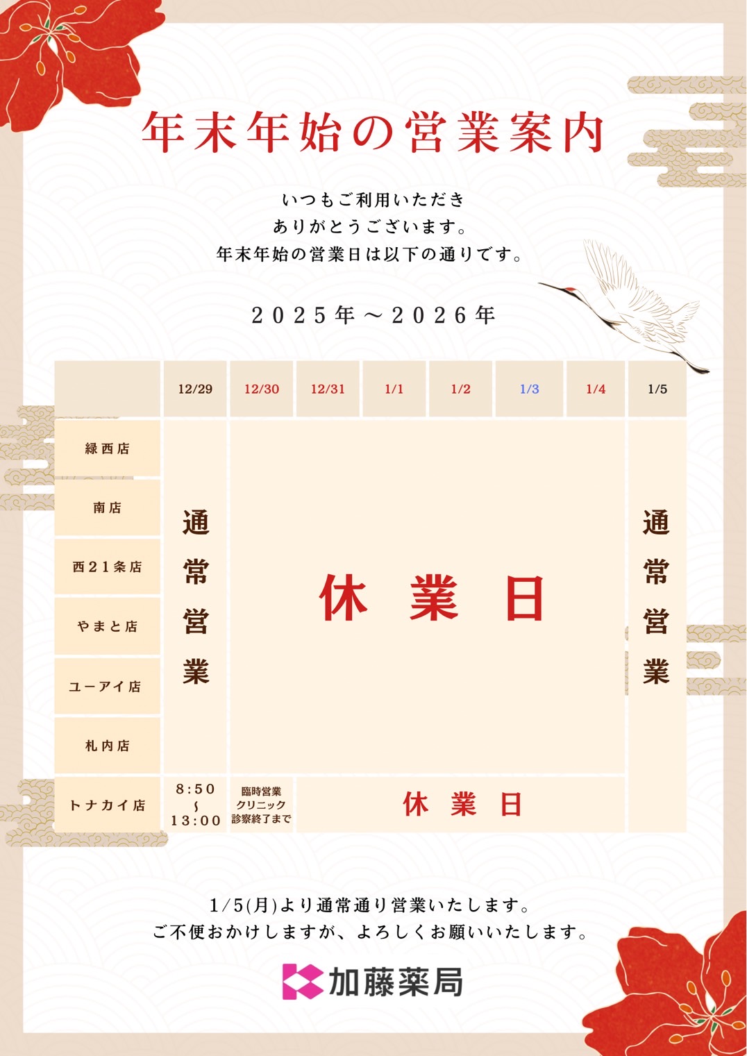 日頃より加藤薬局をご利用いただきありがとうございます。 誠に勝手ながら年末年始の営業日を下記のとおりとさせていただきます。 処方箋受付は営業時間内の対応になりますのでご了承ください。 また緊急時の対応をおこなっていますので直接各店舗の電話におかけください。 来年もよろしくお願い申し上げます。 良いお年をお迎えください。